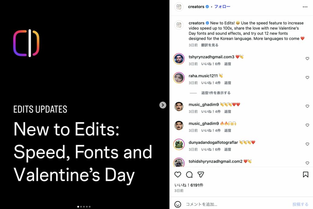 Instagram Editsに新機能登場:最大100倍速・バレンタイン限定フォントを追加