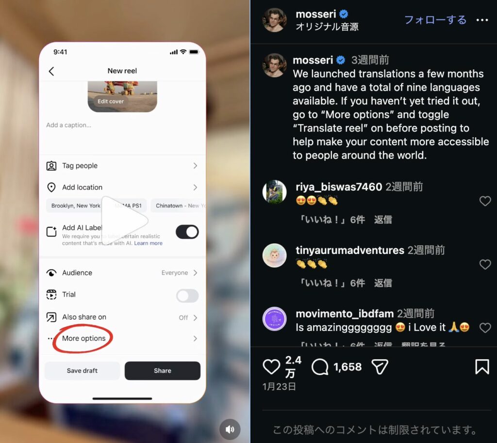 InstagramリールにAI自動翻訳機能を強化